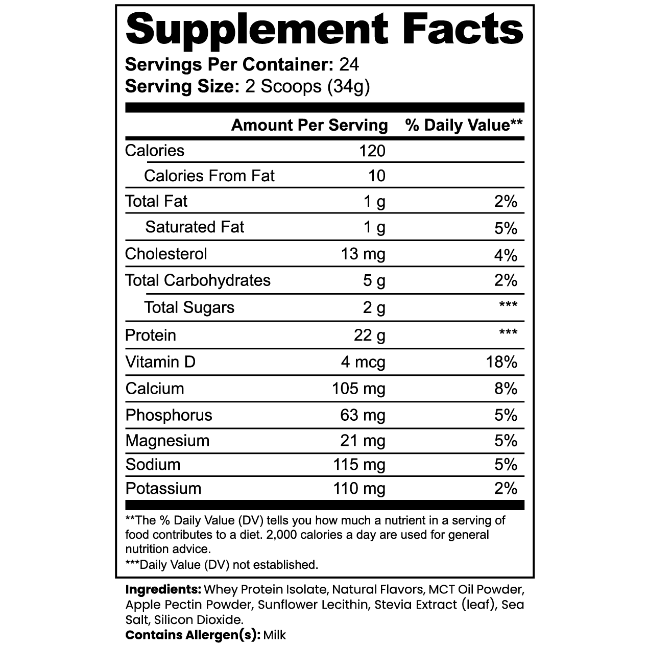 Ingredients: Whey Protein Isolate, Natural Flavors, MCT Oil Powder, Apple Pectin Powder, Sunflower Lecithin, Stevia Extract (leaf), Sea Salt, Silicon Dioxide.